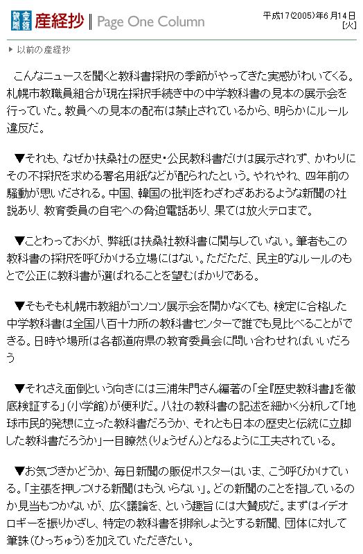 札幌市立小中の教員でつくる日教組傘下の札幌市教職員組合(札教組)が、現在採択手続き中の中学教科書の見本を独自入手し、組合員らを対象にした展示会を行っていることが十一日分かった。見本の教員への提供は文部科学省通知で禁止されている。新しい歴史教科書をつくる会のメンバーらが執筆した扶桑社の歴史・公民教科書は展示されておらず、上部団体の北海道教組(北教組)は、扶桑社教科書を採択させないよう現場教員に呼びかける「職場討議資料」を配布するなど、特定教科書を狙い撃ちした不採択運動を展開している。